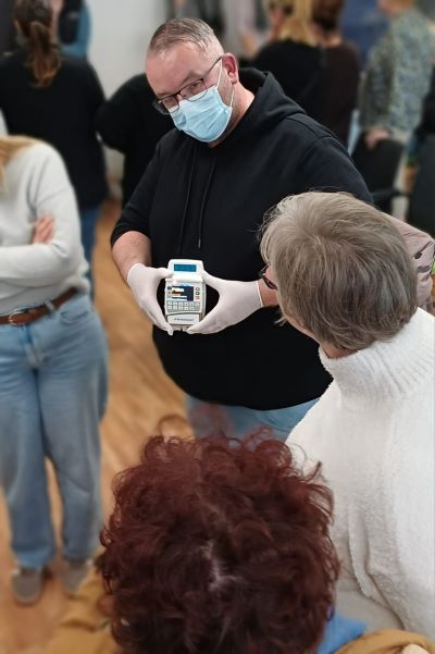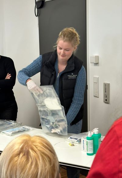 Unsere Mitarbeiter, Patrik und Lea zeigten welche Hygieneschritte bei der Zubereitung einer Infusion wichtig sind. Auch das Aufziehen von Zusätzen sowie der Umgang mit allen benötigten Materialien wurden gezeigt. Darüber hinaus hatten die Anwesenden die Gelegenheit, eine neue Infusionspumpe im Detail kennenzulernen und selbst auszuprobieren.